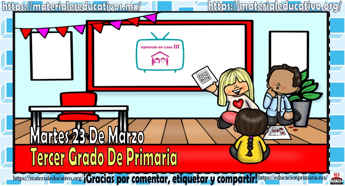 Amigos, compañeros docentes, padres de familia y alumnos que nos visitan, como ya es costumbre nosotros les proporcionaremos las clases contempladas para observarse en la TV del programa aprende en casa III, lo que antes se conocía como videos y preguntas. En esta oportunidad les queremos proporcionar las clases del tercer grado de primaria del martes 23 de marzo del 2021 del presente ciclo escolar 2020 – 2021, estaremos seguros que con este material podrá facilitar la realización de las actividades planteadas por parte del programa. Muchas gracias por visitarnos y recuerden que aquí podrán encontrar las preguntas, videos y todas las clases del programa de aprende en casa 2. Recuerden compartir nuestros enlaces en sus redes sociales y etiquetar a sus compañeros y amigos docentes en nuestras publicaciones.