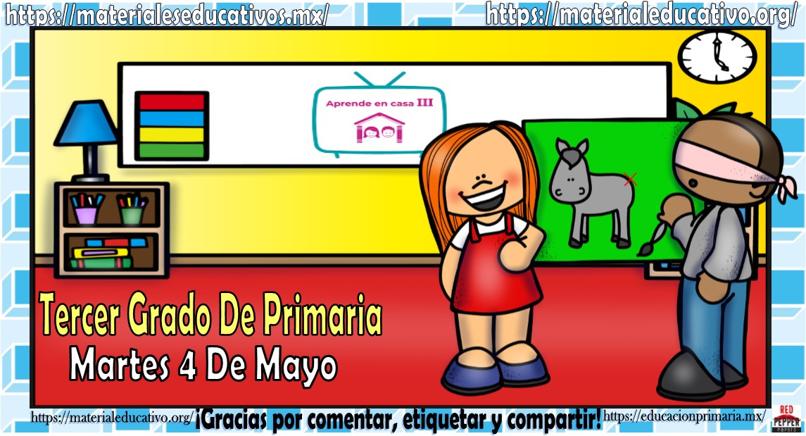 Amigos, compañeros docentes, padres de familia y alumnos que nos visitan, como ya es costumbre nosotros les proporcionaremos las clases contempladas para observarse en la TV del programa aprende en casa III, lo que antes se conocía como videos y preguntas. En esta oportunidad les queremos proporcionar las clases del tercer grado de primaria del martes 4 de mayo del 2021 del presente ciclo escolar 2020 – 2021, estaremos seguros que con este material podrá facilitar la realización de las actividades planteadas por parte del programa. Muchas gracias por visitarnos y recuerden que aquí podrán encontrar las preguntas, videos y todas las clases del programa de aprende en casa 2. Recuerden compartir nuestros enlaces en sus redes sociales y etiquetar a sus compañeros y amigos docentes en nuestras publicaciones.