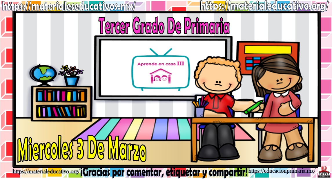 Amigos, compañeros docentes, padres de familia y alumnos que nos visitan, como ya es costumbre nosotros les proporcionaremos las clases contempladas para observarse en la TV del programa aprende en casa III, lo que antes se conocía como videos y preguntas. En esta oportunidad les queremos proporcionar las clases del tercer grado de primaria del miércoles 3 de marzo del 2021 del presente ciclo escolar 2020 – 2021, estaremos seguros que con este material podrá facilitar la realización de las actividades planteadas por parte del programa. Muchas gracias por visitarnos y recuerden que aquí podrán encontrar las preguntas, videos y todas las clases del programa de aprende en casa 2. Recuerden compartir nuestros enlaces en sus redes sociales y etiquetar a sus compañeros y amigos docentes en nuestras publicaciones.