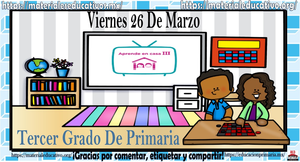 Amigos, compañeros docentes, padres de familia y alumnos que nos visitan, como ya es costumbre nosotros les proporcionaremos las clases contempladas para observarse en la TV del programa aprende en casa III, lo que antes se conocía como videos y preguntas. En esta oportunidad les queremos proporcionar las clases del tercer grado de primaria del viernes 26 de marzo del 2021 del presente ciclo escolar 2020 – 2021, estaremos seguros que con este material podrá facilitar la realización de las actividades planteadas por parte del programa. Muchas gracias por visitarnos y recuerden que aquí podrán encontrar las preguntas, videos y todas las clases del programa de aprende en casa 2. Recuerden compartir nuestros enlaces en sus redes sociales y etiquetar a sus compañeros y amigos docentes en nuestras publicaciones.
