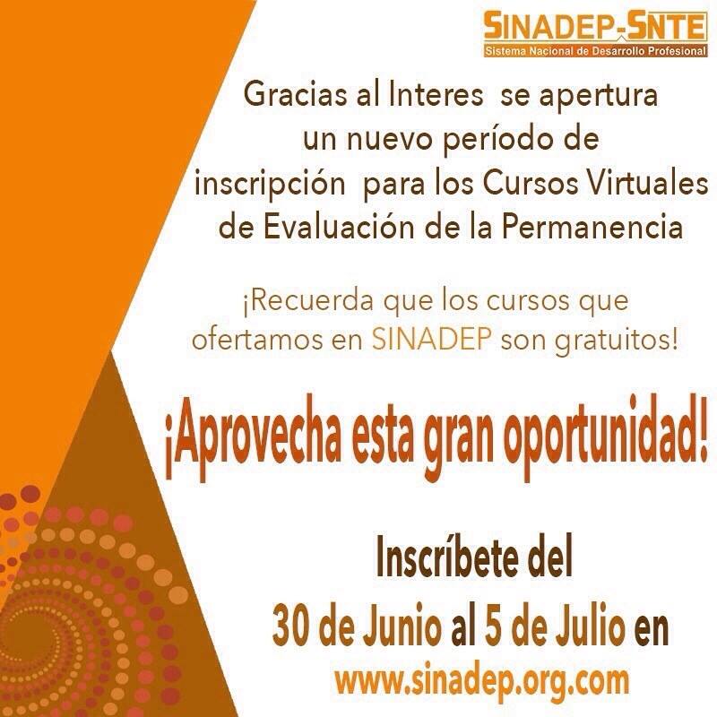 De acuerdo al SINADEP se extiende el periodo de inscripciones a los cursos virtuales de evaluación para la permanencia, esperamos que se puedan inscribir a estos cursos y seguir preparándose para la evaluación docente de permanencia, agradecemos que nos sigan apoyando compañeros docentes.