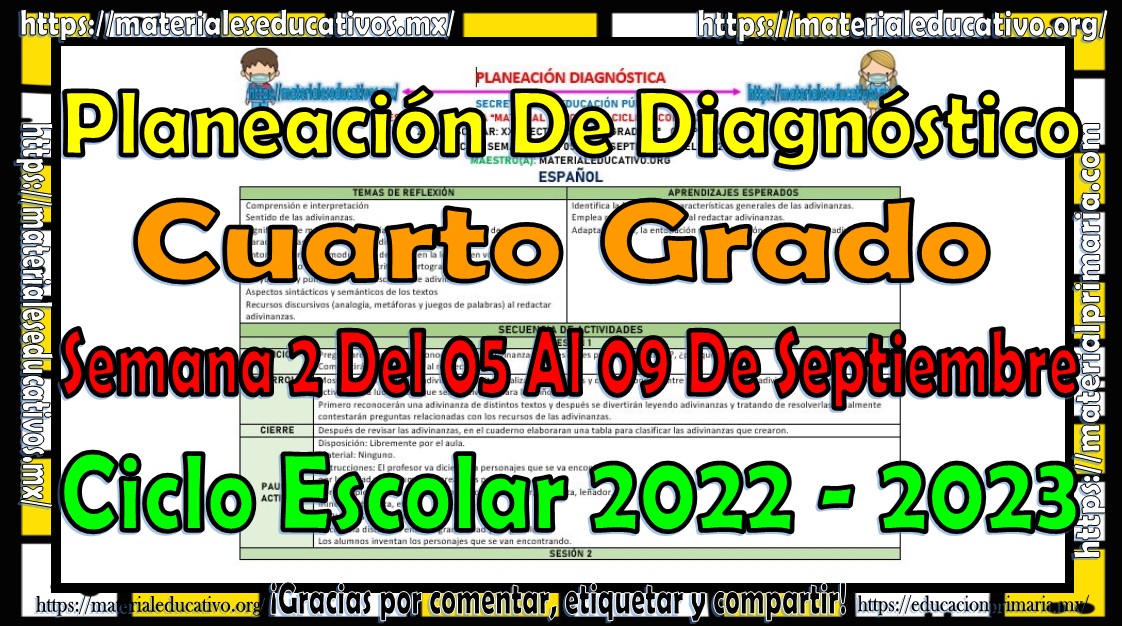 Compañeros y compañeras que nos acompañan, es un gusto personal que nos acompañen en un nuevo ciclo escolar, una aventura de conocimientos por descubrir, en esta oportunidad les queremos compartir la planeación de diagnóstico del cuarto grado de primaria de la segunda semana de clases del 05 al 09 de septiembre del ciclo escolar 2022 – 2023, planeaciones que semana tras semana les estaremos compartiendo, de la misma manera les estaremos proporcionando en este nuevo ciclo escolar las planeaciones por mes, para que les sirva de apoyo y ayuda en su labor educativa, nos llena de felicidad que nos sigan apoyando, visitando nuestra página y recomendándonos con sus compañeros y amigos docentes, esperamos que sea un nuevo ciclo escolar lleno de salud y mucho éxito.