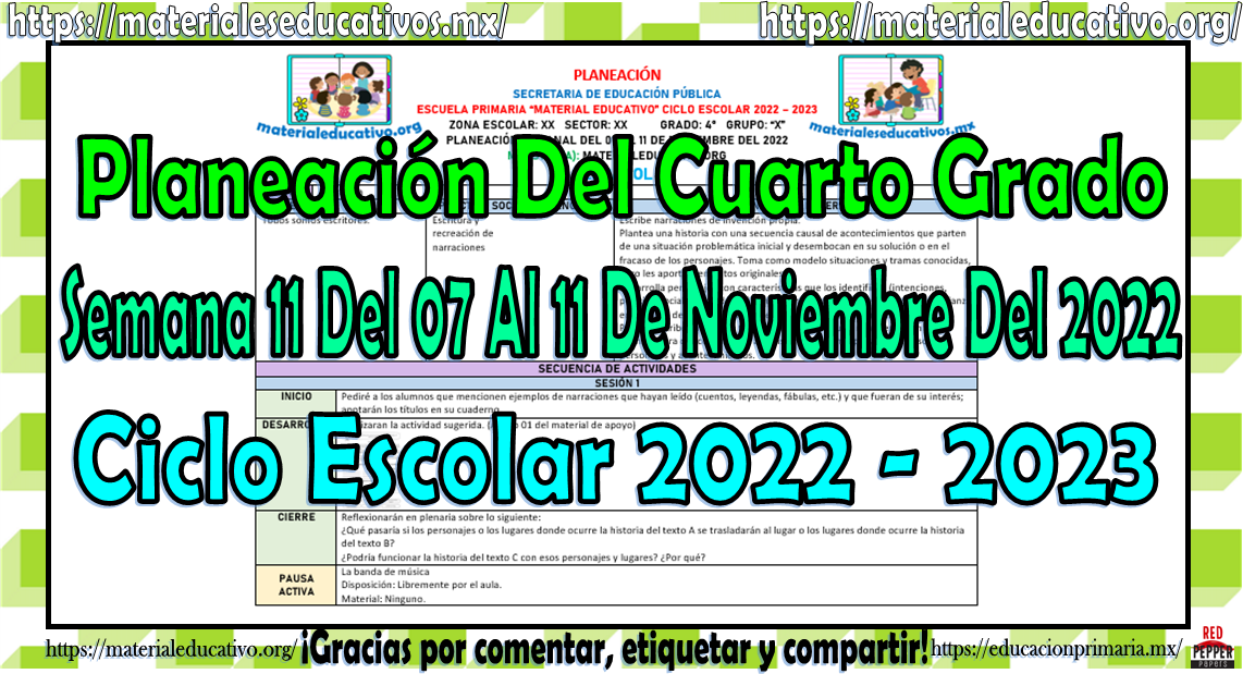 Amigos y amigas maestras que nos acompañan, queremos compartir con todos ustedes la planeación del cuarto grado de primaria de la semana 11 del 07 al 11 de noviembre del ciclo escolar 2022 – 2023, estas planeaciones están realizadas de acuerdo al plan y programas de estudio del grado, la secuencia se realizo de acuerdo a los contenidos del presente trimestre, como saben también estamos elaborando y compartiendo con todos ustedes las planeaciones por mes, los cuales pueden consultar aquí y los planes de atención que también pueden consultar aquí, agradecemos que nos acompañen y visiten, les pedimos que nos apoyen compartiendo nuestros enlaces en sus redes sociales y etiqueten a sus compañeros y amigos docentes en nuestras publicaciones. Muchas gracias.