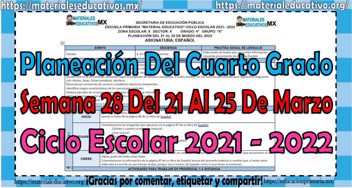 Amigos y compañeros docentes que nos visitan, queremos compartir con todos ustedes la planeación del cuarto grado de primaria semana 28 del 21 al 25 de marzo del ciclo escolar 2021 – 2022 de acuerdo a los contenidos del grado con anexos las cuales nos ayudara a complementar las actividades planeadas, esperamos que les sean de gran utilidad para su labor educativa, les queremos pedir que nos apoyen compartiendo nuestros enlaces en sus redes sociales y etiqueten a sus compañeros y amigos docentes en nuestras publicaciones.