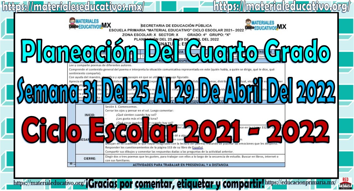 Amigos y compañeros docentes que nos visitan, queremos compartir con todos ustedes la planeación del cuarto grado de primaria semana 31 del 25 al 29 de abril del ciclo escolar 2021 – 2022 de acuerdo a los contenidos del grado con anexos las cuales nos ayudara a complementar las actividades planeadas, esperamos que les sean de gran utilidad para su labor educativa, les queremos pedir que nos apoyen compartiendo nuestros enlaces en sus redes sociales y etiqueten a sus compañeros y amigos docentes en nuestras publicaciones.