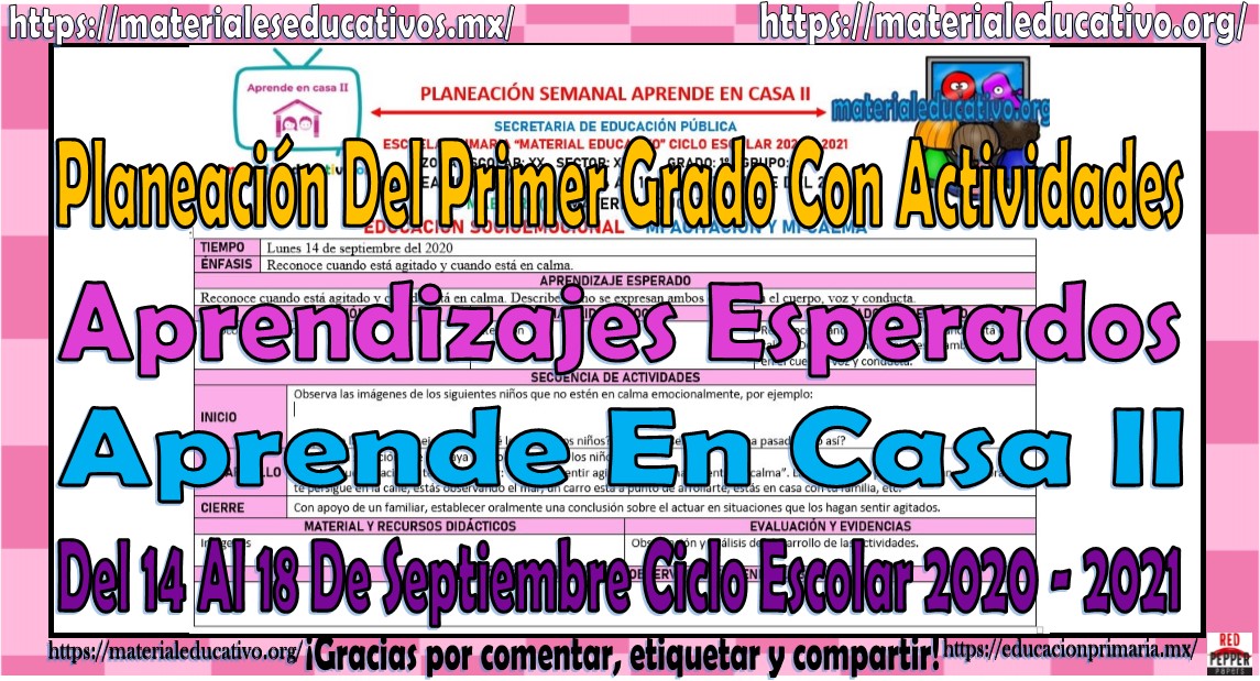 Compañeros y amigos docentes que nos visitan, en esta ocasión queremos compartir con todos ustedes la planeación del primer grado con actividades de acuerdo a los aprendizajes esperados de la programación televisiva de Aprende en Casa II del 14 al 18 de septiembre ciclo escolar 2020 – 2021. Como se menciona estas planeaciones corresponden a dicha semana y están diseñadas de acuerdo a la programación televisaba, recuerden que no es necesario utilizar todas para no sobrecargar a los alumnos de trabajos, estamos seguros que este material que les proporcionamos les va a encantar, les pedimos que nos apoyen por favor compartiendo materialeducativo.org para poder seguir compartiéndoles el mejor material educativa, muchas gracias por su magnífico apoyo compartiendo nuestros enlaces en sus redes sociales y etiquetando a sus compañeros y amigos docentes en nuestras publicaciones.