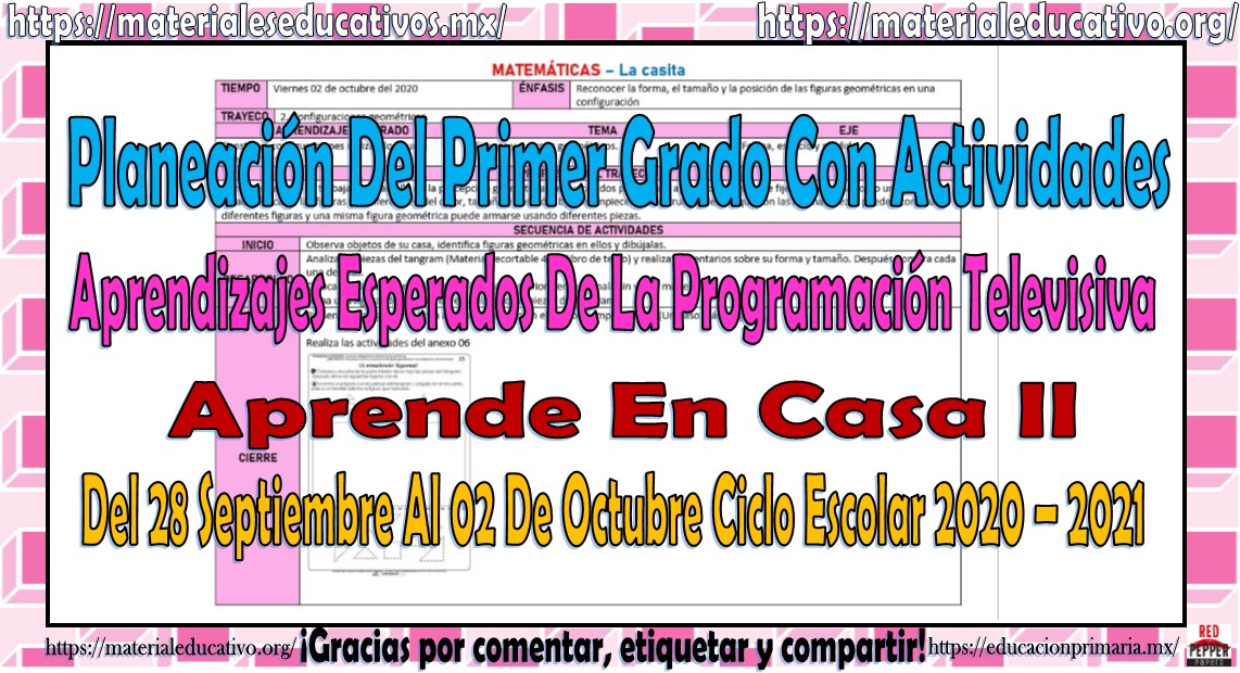 Compañeros y amigos docentes que nos visitan, en esta ocasión queremos compartir con todos ustedes la planeación del primer grado con actividades de acuerdo a los aprendizajes esperados de la programación televisiva de Aprende en Casa II del 28 de septiembre al 02 de octubre del ciclo escolar 2020 – 2021. Como se menciona estas planeaciones corresponden a dicha semana y están diseñadas de acuerdo a la programación televisaba, recuerden que no es necesario utilizar todas para no sobrecargar a los alumnos de trabajos, estamos seguros que este material que les proporcionamos les va a encantar, les pedimos que nos apoyen por favor compartiendo materialeducativo.org para poder seguir compartiéndoles el mejor material educativa, muchas gracias por su magnífico apoyo compartiendo nuestros enlaces en sus redes sociales y etiquetando a sus compañeros y amigos docentes en nuestras publicaciones.