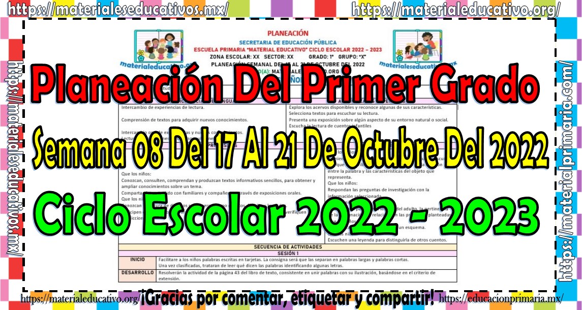 Amigos y amigas maestras que nos acompañan, queremos compartir con todos ustedes la planeación del primer grado de primaria de la semana 08 del 17 al 21 de octubre del ciclo escolar 2022 – 2023, estas planeaciones están realizadas de acuerdo al plan y programas de estudio del grado, la secuencia se realizo de acuerdo a los contenidos del presente trimestre, como saben también estamos elaborando y compartiendo con todos ustedes las planeaciones por mes, los cuales pueden consultar aquí y los planes de atención que también pueden consultar aquí, agradecemos que nos acompañen y visiten, les pedimos que nos apoyen compartiendo nuestros enlaces en sus redes sociales y etiqueten a sus compañeros y amigos docentes en nuestras publicaciones. Muchas gracias.