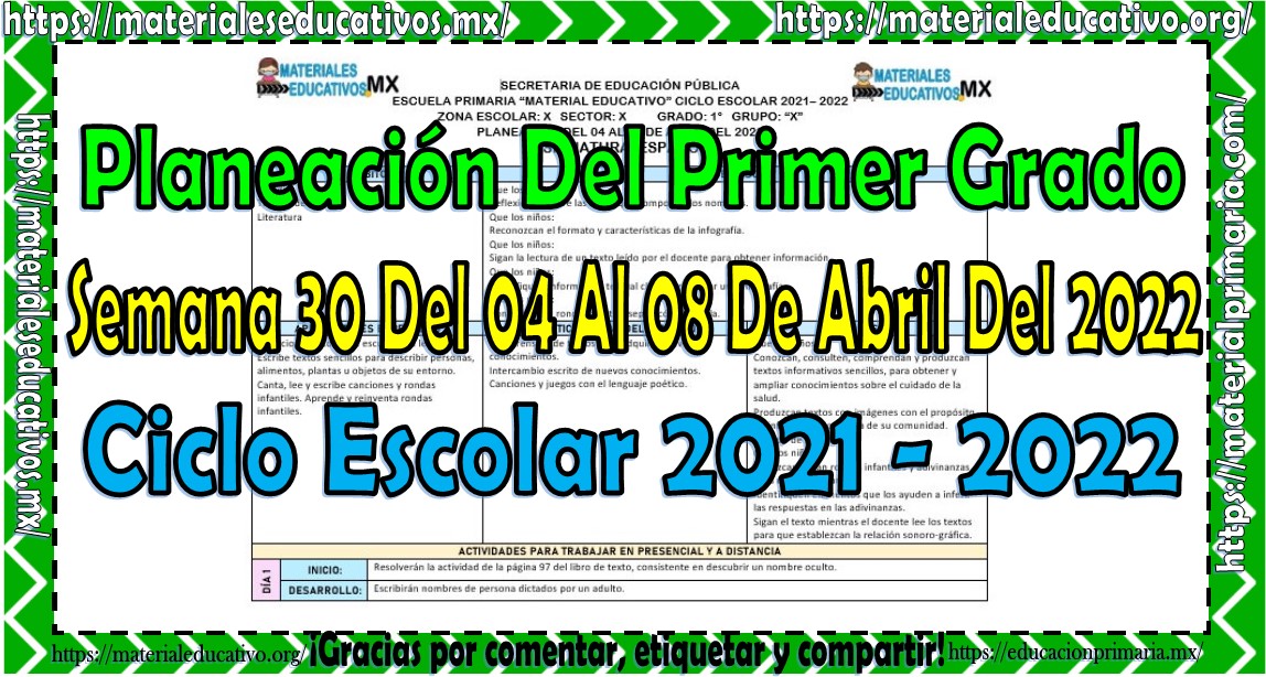 Amigos y compañeros docentes que nos visitan, queremos compartir con todos ustedes la planeación del primer grado de primaria semana 30 del 04 al 08 de abril del ciclo escolar 2021 – 2022 de acuerdo a los contenidos del grado con anexos las cuales nos ayudara a complementar las actividades planeadas, esperamos que les sean de gran utilidad para su labor educativa, les queremos pedir que nos apoyen compartiendo nuestros enlaces en sus redes sociales y etiqueten a sus compañeros y amigos docentes en nuestras publicaciones.