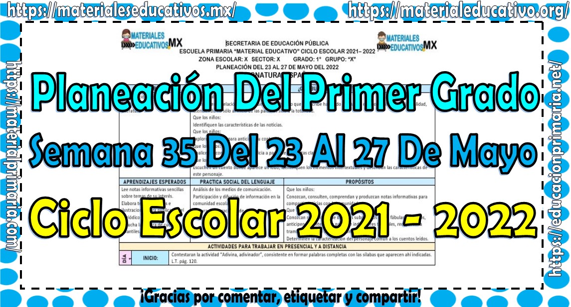 Amigos y compañeros docentes que nos visitan, queremos compartir con todos ustedes la planeación del primer grado de primaria semana 35 del 23 al 27 de mayo del ciclo escolar 2021 – 2022 de acuerdo a los contenidos del grado con anexos las cuales nos ayudara a complementar las actividades planeadas, esperamos que les sean de gran utilidad para su labor educativa, les queremos pedir que nos apoyen compartiendo nuestros enlaces en sus redes sociales y etiqueten a sus compañeros y amigos docentes en nuestras publicaciones.