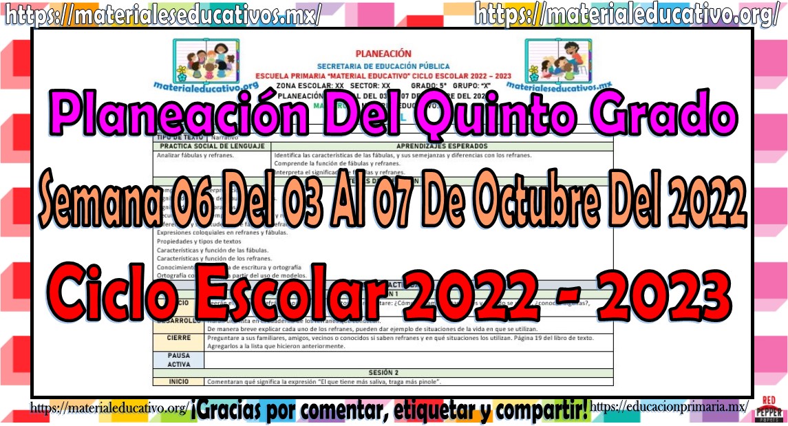 Amigos y amigas maestras que nos acompañan, queremos compartir con todos ustedes la planeación del quinto grado de primaria de la semana 06 del 03 al 07 de octubre del ciclo escolar 2022 – 2023, estas planeaciones están realizadas de acuerdo al plan y programas de estudio del grado, la secuencia se realizo de acuerdo a los contenidos del presente trimestre, como saben también estamos elaborando y compartiendo con todos ustedes las planeaciones por mes, los cuales pueden consultar aquí y los planes de atención que también pueden consultar aquí, agradecemos que nos acompañen y visiten, les pedimos que nos apoyen compartiendo nuestros enlaces en sus redes sociales y etiqueten a sus compañeros y amigos docentes en nuestras publicaciones. Muchas gracias.