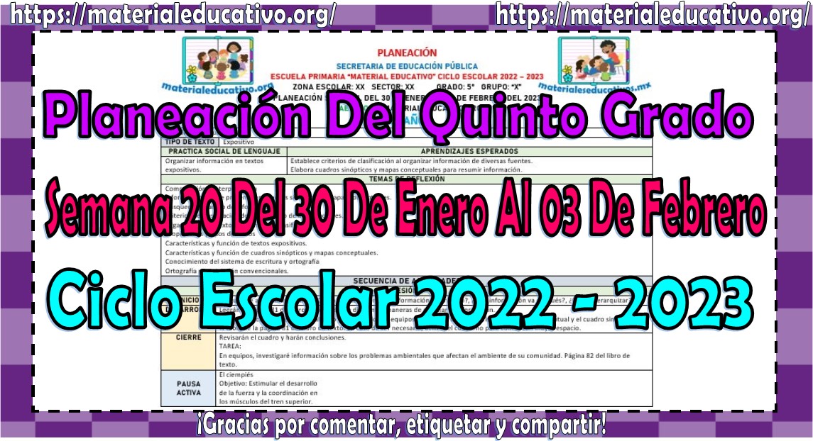 Amigos y amigas maestras que nos acompañan, queremos compartir con todos ustedes la planeación del quinto grado de primaria de la semana 20 del 30 de enero al 03 de febrero del ciclo escolar 2022 – 2023, estas planeaciones están realizadas de acuerdo al plan y programas de estudio del grado, la secuencia se realizo de acuerdo a los contenidos del presente trimestre, como saben también estamos elaborando y compartiendo con todos ustedes las planeaciones por mes, los cuales pueden consultar aquí y los planes de atención que también pueden consultar aquí, agradecemos que nos acompañen y visiten, les pedimos que nos apoyen compartiendo nuestros enlaces en sus redes sociales y etiqueten a sus compañeros y amigos docentes en nuestras publicaciones. Muchas gracias.