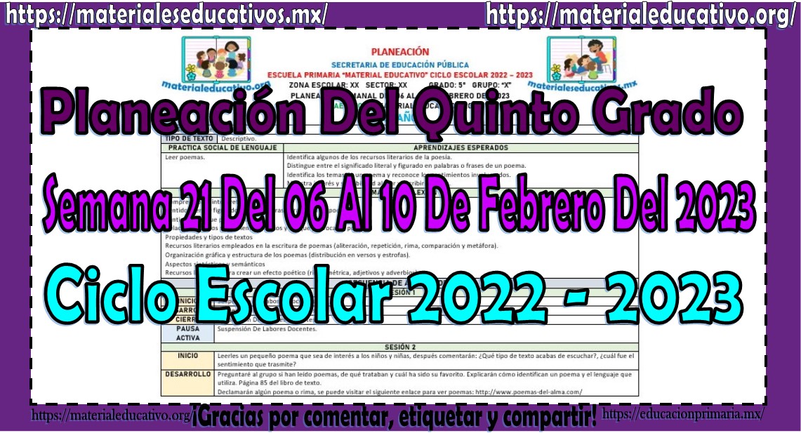 Amigos y amigas maestras que nos acompañan, queremos compartir con todos ustedes la planeación del quinto grado de primaria de la semana 21 del 06 al 10 de febrero del ciclo escolar 2022 – 2023, estas planeaciones están realizadas de acuerdo al plan y programas de estudio del grado, la secuencia se realizo de acuerdo a los contenidos del presente trimestre, como saben también estamos elaborando y compartiendo con todos ustedes las planeaciones por mes, los cuales pueden consultar aquí y los planes de atención que también pueden consultar aquí, agradecemos que nos acompañen y visiten, les pedimos que nos apoyen compartiendo nuestros enlaces en sus redes sociales y etiqueten a sus compañeros y amigos docentes en nuestras publicaciones. Muchas gracias.