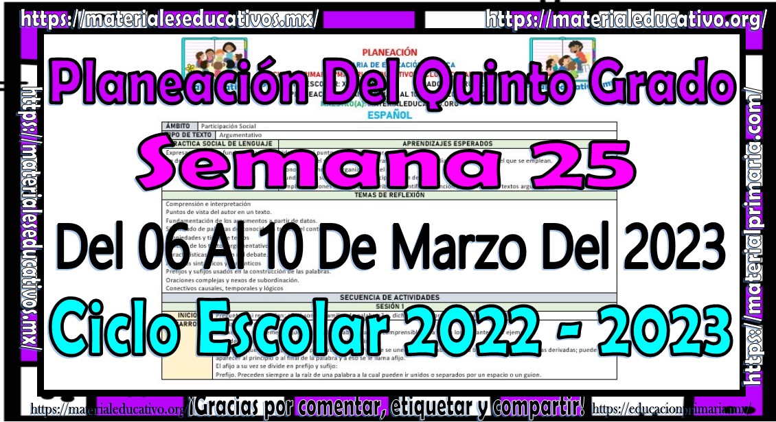 Amigos y amigas maestras que nos acompañan, queremos compartir con todos ustedes la planeación del quinto grado de primaria de la semana 25 del 06 al 10 de marzo del ciclo escolar 2022 – 2023, estas planeaciones están realizadas de acuerdo al plan y programas de estudio del grado, la secuencia se realizo de acuerdo a los contenidos del presente trimestre, como saben también estamos elaborando y compartiendo con todos ustedes las planeaciones por mes, los cuales pueden consultar aquí y los planes de atención que también pueden consultar aquí, agradecemos que nos acompañen y visiten, les pedimos que nos apoyen compartiendo nuestros enlaces en sus redes sociales y etiqueten a sus compañeros y amigos docentes en nuestras publicaciones. Muchas gracias.