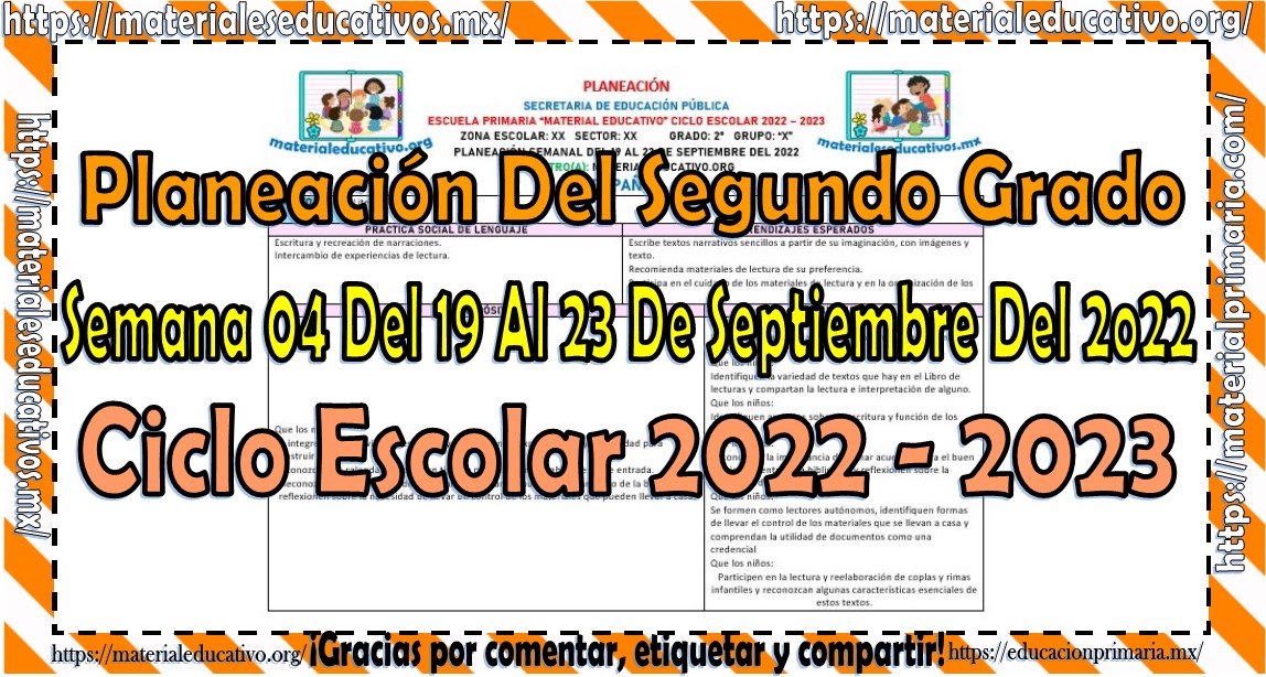 Amigos y amigas maestras que nos acompañan, queremos compartir con todos ustedes la planeación del segundo grado de primaria de la semana 04 del 19 al 23 de septiembre del ciclo escolar 2022 – 2023, estas planeaciones están realizadas de acuerdo al plan y programas de estudio del grado, la secuencia se realizo de acuerdo a los contenidos del presente trimestre, como saben también estamos elaborando y compartiendo con todos ustedes las planeaciones por mes, los cuales pueden consultar aquí y los planes de atención que también pueden consultar aquí, agradecemos que nos acompañen y visiten, les pedimos que nos apoyen compartiendo nuestros enlaces en sus redes sociales y etiqueten a sus compañeros y amigos docentes en nuestras publicaciones. Muchas gracias.