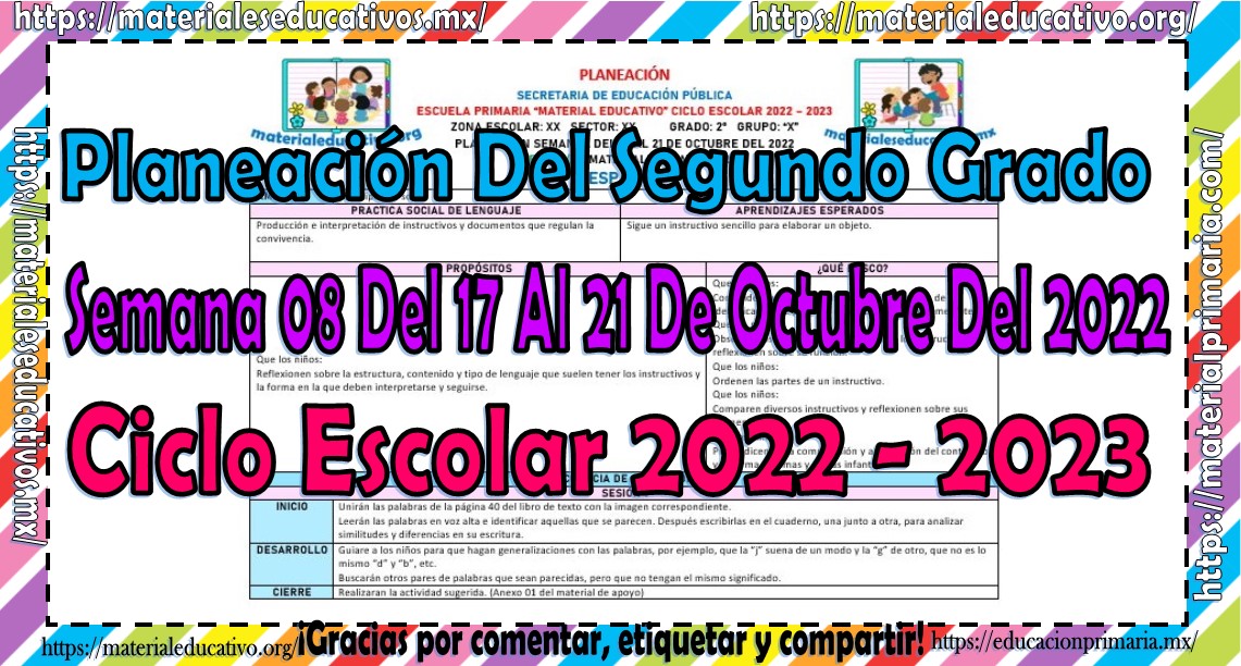 Amigos y amigas maestras que nos acompañan, queremos compartir con todos ustedes la planeación del segundo grado de primaria de la semana 08 del 17 al 21 de octubre del ciclo escolar 2022 – 2023, estas planeaciones están realizadas de acuerdo al plan y programas de estudio del grado, la secuencia se realizo de acuerdo a los contenidos del presente trimestre, como saben también estamos elaborando y compartiendo con todos ustedes las planeaciones por mes, los cuales pueden consultar aquí y los planes de atención que también pueden consultar aquí, agradecemos que nos acompañen y visiten, les pedimos que nos apoyen compartiendo nuestros enlaces en sus redes sociales y etiqueten a sus compañeros y amigos docentes en nuestras publicaciones. Muchas gracias.