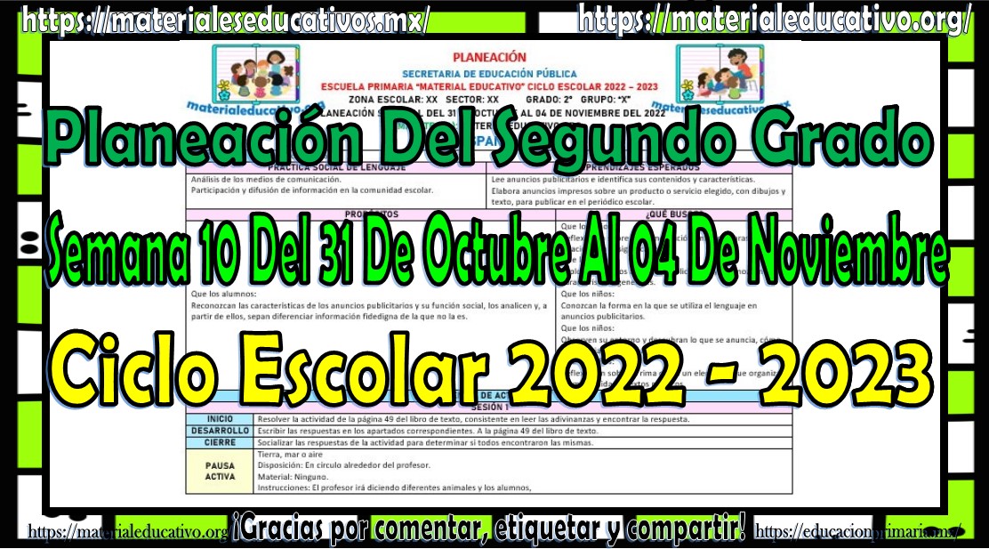 Amigos y amigas maestras que nos acompañan, queremos compartir con todos ustedes la planeación del segundo grado de primaria de la semana 10 del 31 de octubre al 04 de noviembre del ciclo escolar 2022 – 2023, estas planeaciones están realizadas de acuerdo al plan y programas de estudio del grado, la secuencia se realizo de acuerdo a los contenidos del presente trimestre, como saben también estamos elaborando y compartiendo con todos ustedes las planeaciones por mes, los cuales pueden consultar aquí y los planes de atención que también pueden consultar aquí, agradecemos que nos acompañen y visiten, les pedimos que nos apoyen compartiendo nuestros enlaces en sus redes sociales y etiqueten a sus compañeros y amigos docentes en nuestras publicaciones. Muchas gracias.