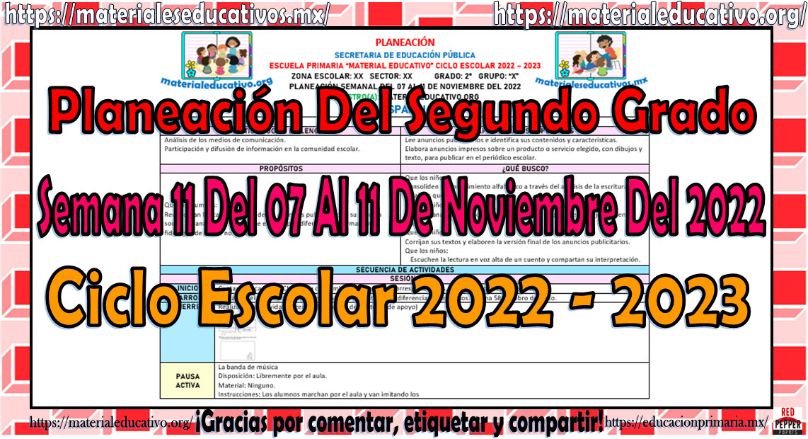 Amigos y amigas maestras que nos acompañan, queremos compartir con todos ustedes la planeación del segundo grado de primaria de la semana 11 del 07 al 11 de noviembre del ciclo escolar 2022 – 2023, estas planeaciones están realizadas de acuerdo al plan y programas de estudio del grado, la secuencia se realizo de acuerdo a los contenidos del presente trimestre, como saben también estamos elaborando y compartiendo con todos ustedes las planeaciones por mes, los cuales pueden consultar aquí y los planes de atención que también pueden consultar aquí, agradecemos que nos acompañen y visiten, les pedimos que nos apoyen compartiendo nuestros enlaces en sus redes sociales y etiqueten a sus compañeros y amigos docentes en nuestras publicaciones. Muchas gracias.