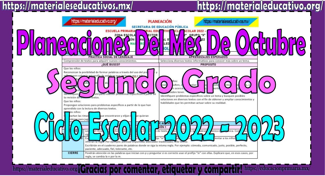 Amigas y amigos maestros que nos visitan, en esta oportunidad queremos compartir con todos ustedes la planeación del segundo grado de primaria del mes de octubre del ciclo escolar 2022 – 2023 que les servirá para planificar sus actividades didácticas de manera mensual para su grupo, recordándoles que pueden utilizar la planeación tal como se encuentra o modificándola y adaptándola de acuerdo a las necesidades y características de su grupo, les agradecemos que nos sigan visitando y les pedimos que nos apoyen compartiendo nuestros enlaces en sus redes sociales y etiquetando a sus compañeros y amigos docentes en nuestras publicaciones, muchas gracias.