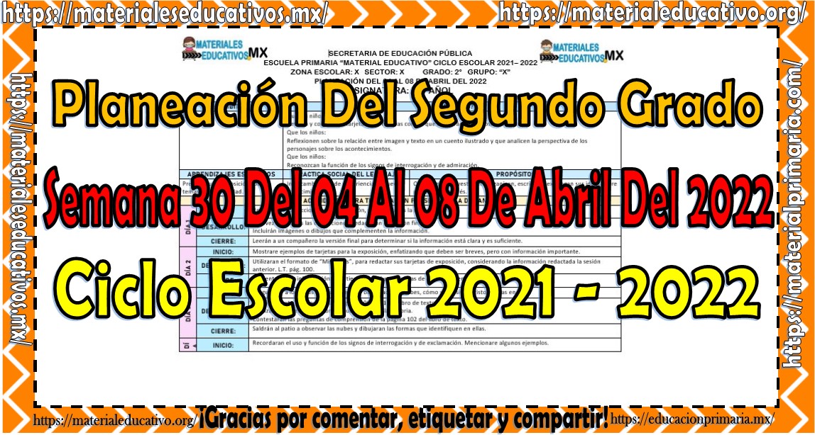 Amigos y compañeros docentes que nos visitan, queremos compartir con todos ustedes la planeación del segundo grado de primaria semana 30 del 04 al 08 de abril del ciclo escolar 2021 – 2022 de acuerdo a los contenidos del grado con anexos las cuales nos ayudara a complementar las actividades planeadas, esperamos que les sean de gran utilidad para su labor educativa, les queremos pedir que nos apoyen compartiendo nuestros enlaces en sus redes sociales y etiqueten a sus compañeros y amigos docentes en nuestras publicaciones.