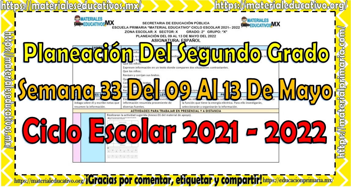 Amigos y compañeros docentes que nos visitan, queremos compartir con todos ustedes la planeación del segundo grado de primaria semana 33 del 09 al 13 de mayo del ciclo escolar 2021 – 2022 de acuerdo a los contenidos del grado con anexos las cuales nos ayudara a complementar las actividades planeadas, esperamos que les sean de gran utilidad para su labor educativa, les queremos pedir que nos apoyen compartiendo nuestros enlaces en sus redes sociales y etiqueten a sus compañeros y amigos docentes en nuestras publicaciones.