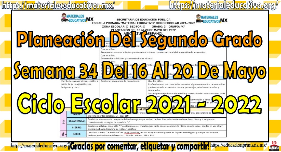 Amigos y compañeros docentes que nos visitan, queremos compartir con todos ustedes la planeación del segundo grado de primaria semana 34 del 16 al 20 de mayo del ciclo escolar 2021 – 2022 de acuerdo a los contenidos del grado con anexos las cuales nos ayudara a complementar las actividades planeadas, esperamos que les sean de gran utilidad para su labor educativa, les queremos pedir que nos apoyen compartiendo nuestros enlaces en sus redes sociales y etiqueten a sus compañeros y amigos docentes en nuestras publicaciones.