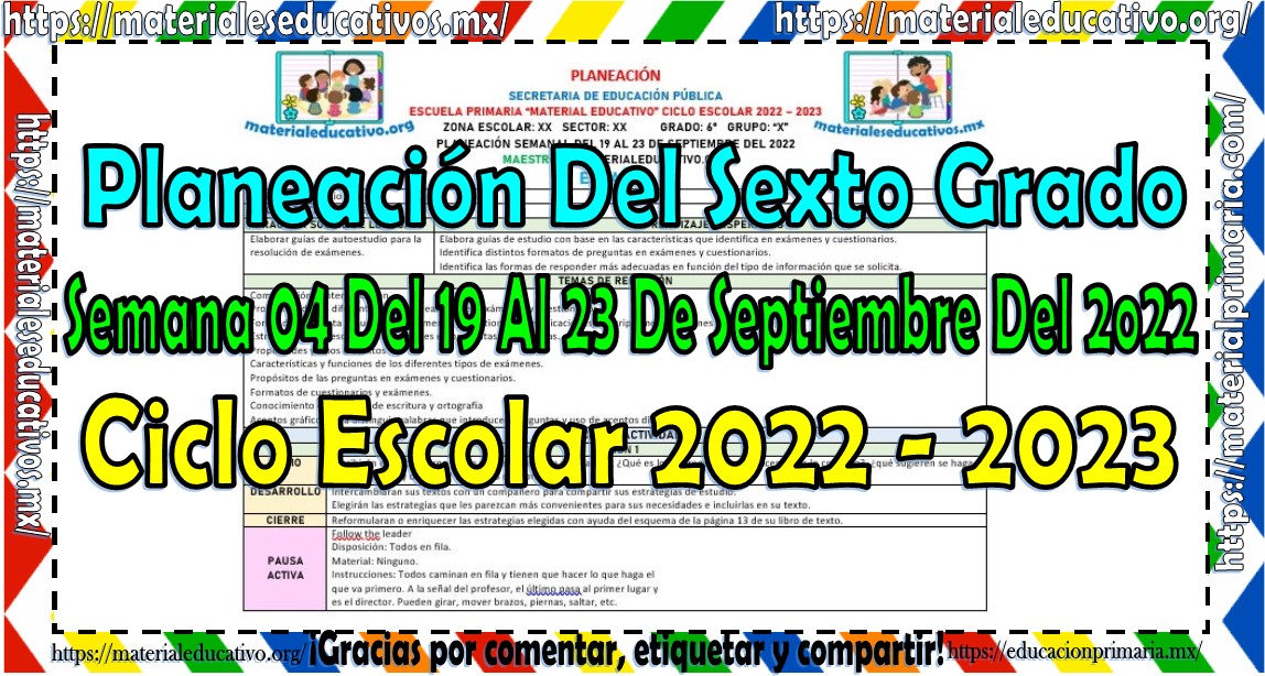 Amigos y amigas maestras que nos acompañan, queremos compartir con todos ustedes la planeación del sexto grado de primaria de la semana 04 del 19 al 23 de septiembre del ciclo escolar 2022 – 2023, estas planeaciones están realizadas de acuerdo al plan y programas de estudio del grado, la secuencia se realizo de acuerdo a los contenidos del presente trimestre, como saben también estamos elaborando y compartiendo con todos ustedes las planeaciones por mes, los cuales pueden consultar aquí y los planes de atención que también pueden consultar aquí, agradecemos que nos acompañen y visiten, les pedimos que nos apoyen compartiendo nuestros enlaces en sus redes sociales y etiqueten a sus compañeros y amigos docentes en nuestras publicaciones. Muchas gracias.