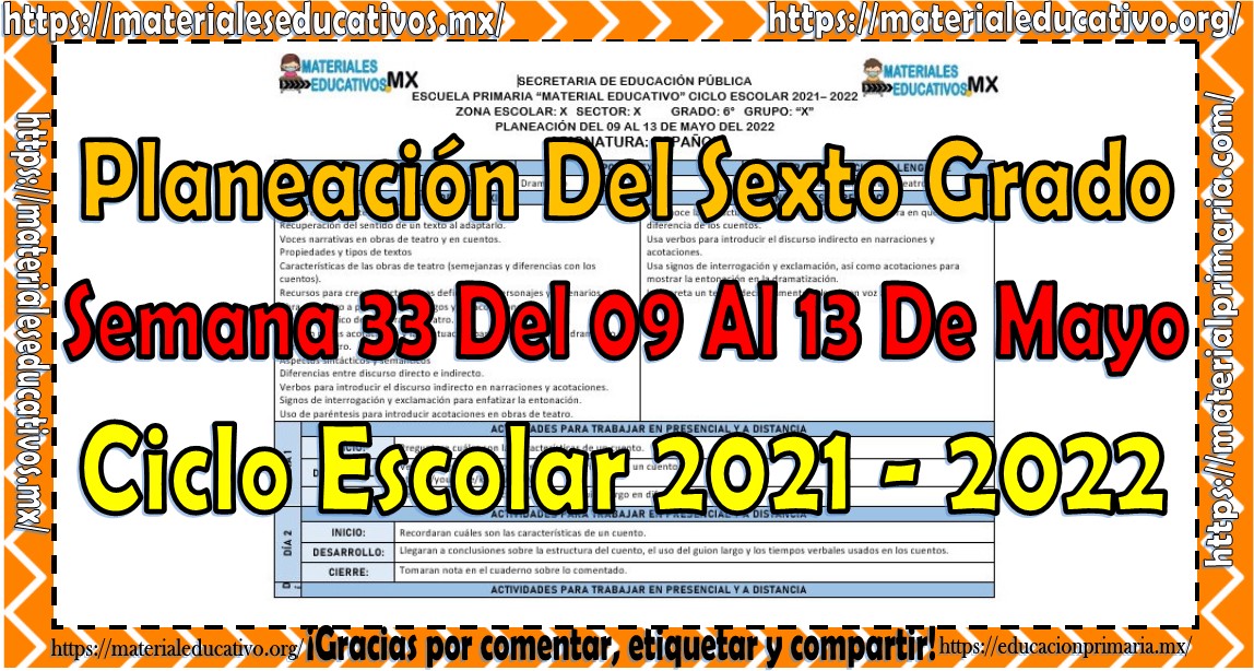 Amigos y compañeros docentes que nos visitan, queremos compartir con todos ustedes la planeación del sexto grado de primaria semana 33 del 09 al 13 de mayo del ciclo escolar 2021 – 2022 de acuerdo a los contenidos del grado con anexos las cuales nos ayudara a complementar las actividades planeadas, esperamos que les sean de gran utilidad para su labor educativa, les queremos pedir que nos apoyen compartiendo nuestros enlaces en sus redes sociales y etiqueten a sus compañeros y amigos docentes en nuestras publicaciones.