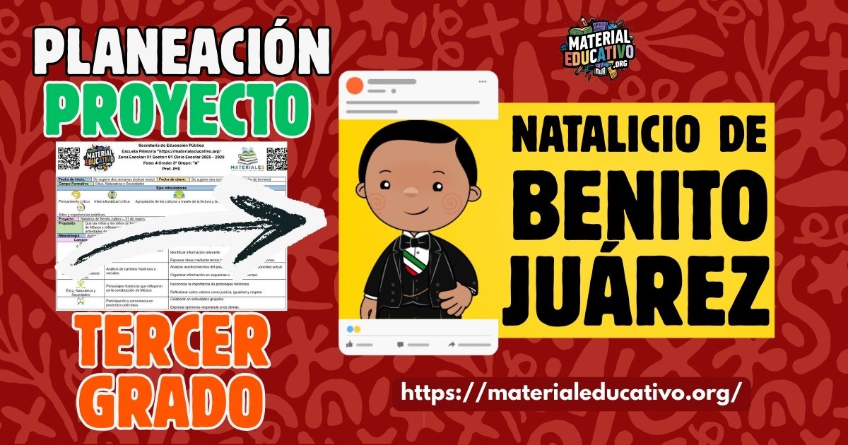 En esta ocasión compartimos una planeación didáctica por proyectos sobre el natalicio de Benito Juárez, diseñada especialmente para alumnos de tercer grado de primaria, Fase 4, de acuerdo con el Plan de Estudios 2022 de la Nueva Escuela Mexicana. Este proyecto permite que las niñas y los niños conozcan de manera sencilla y significativa la vida y la importancia de Benito Juárez en la historia de México, resaltando valores fundamentales como la justicia, el respeto, la igualdad y el esfuerzo personal.