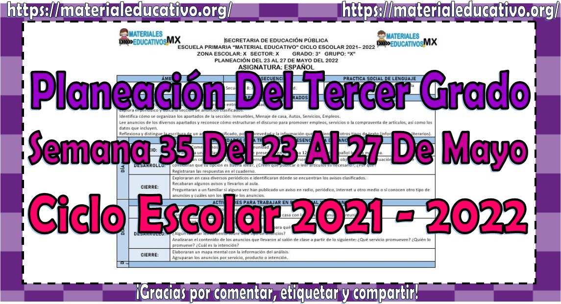Amigos y compañeros docentes que nos visitan, queremos compartir con todos ustedes la planeación del tercer grado de primaria semana 35 del 23 al 27 de mayo del ciclo escolar 2021 – 2022 de acuerdo a los contenidos del grado con anexos las cuales nos ayudara a complementar las actividades planeadas, esperamos que les sean de gran utilidad para su labor educativa, les queremos pedir que nos apoyen compartiendo nuestros enlaces en sus redes sociales y etiqueten a sus compañeros y amigos docentes en nuestras publicaciones.