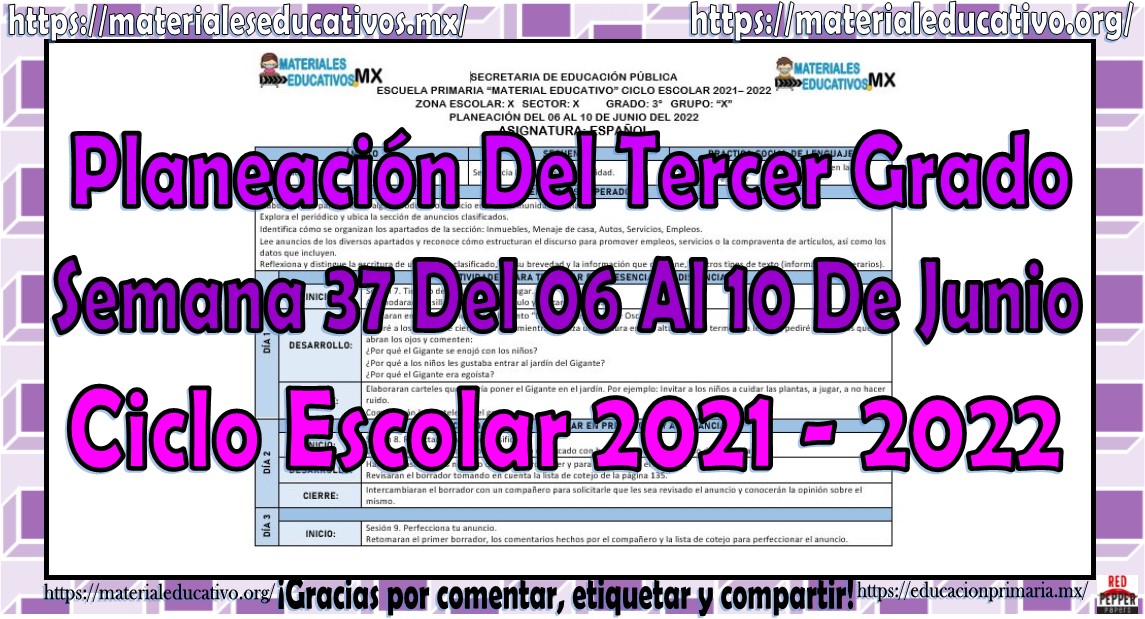 Amigos y compañeros docentes que nos visitan, queremos compartir con todos ustedes la planeación del tercer grado de primaria semana 37 del 06 al 10 de junio del ciclo escolar 2021 – 2022 de acuerdo a los contenidos del grado con anexos las cuales nos ayudara a complementar las actividades planeadas, esperamos que les sean de gran utilidad para su labor educativa, les queremos pedir que nos apoyen compartiendo nuestros enlaces en sus redes sociales y etiqueten a sus compañeros y amigos docentes en nuestras publicaciones.