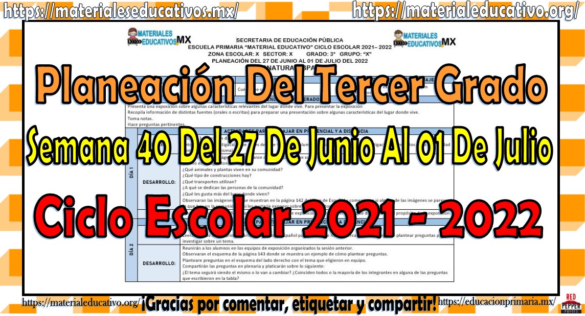 Amigos y compañeros docentes que nos visitan, queremos compartir con todos ustedes la planeación del tercer grado de primaria semana 40 del 27 de junio al 01 de julio del ciclo escolar 2021 – 2022 de acuerdo a los contenidos del grado con anexos las cuales nos ayudara a complementar las actividades planeadas, esperamos que les sean de gran utilidad para su labor educativa, les queremos pedir que nos apoyen compartiendo nuestros enlaces en sus redes sociales y etiqueten a sus compañeros y amigos docentes en nuestras publicaciones.