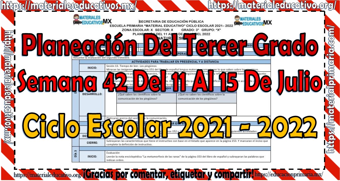Amigos y compañeros docentes que nos visitan, queremos compartir con todos ustedes la planeación del tercer grado de primaria semana 42 del 11 al 15 de julio del ciclo escolar 2021 – 2022 de acuerdo a los contenidos del grado con anexos las cuales nos ayudara a complementar las actividades planeadas, esperamos que les sean de gran utilidad para su labor educativa, les queremos pedir que nos apoyen compartiendo nuestros enlaces en sus redes sociales y etiqueten a sus compañeros y amigos docentes en nuestras publicaciones.
