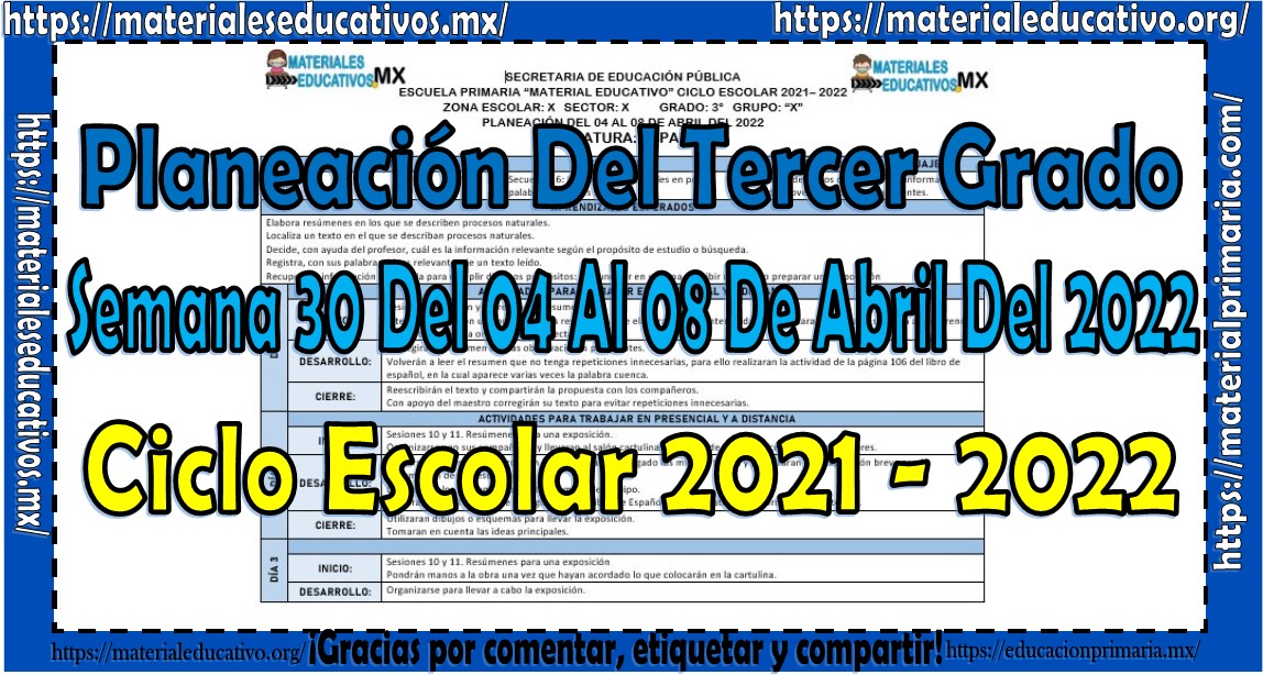 Amigos y compañeros docentes que nos visitan, queremos compartir con todos ustedes la planeación del tercero grado de primaria semana 30 del 04 al 08 de abril del ciclo escolar 2021 – 2022 de acuerdo a los contenidos del grado con anexos las cuales nos ayudara a complementar las actividades planeadas, esperamos que les sean de gran utilidad para su labor educativa, les queremos pedir que nos apoyen compartiendo nuestros enlaces en sus redes sociales y etiqueten a sus compañeros y amigos docentes en nuestras publicaciones.