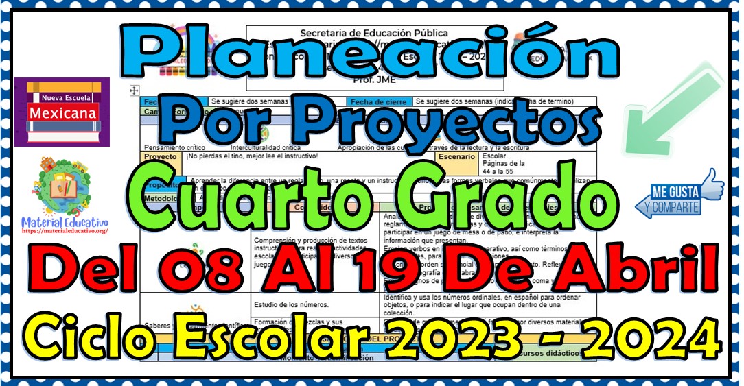 Compañeros maestros y maestras que nos acompañan queremos compartir con todos ustedes la Planeación didáctica por proyectos del cuarto grado de primaria del 08 al 19 de abril del ciclo escolar 2023 – 2024. La Planeación Didáctica por Proyectos en el marco de la Nueva Escuela Mexicana ofrece un enfoque pedagógico que promueve un aprendizaje más significativo, integral y contextualizado. Permite que los estudiantes sean protagonistas de su proceso de aprendizaje, desarrollando habilidades y competencias necesarias para su desarrollo personal y social. Al implementar esta estrategia, nosotros los docentes contribuimos a la formación de ciudadanos comprometidos y preparados para enfrentar los desafíos del siglo XXI.