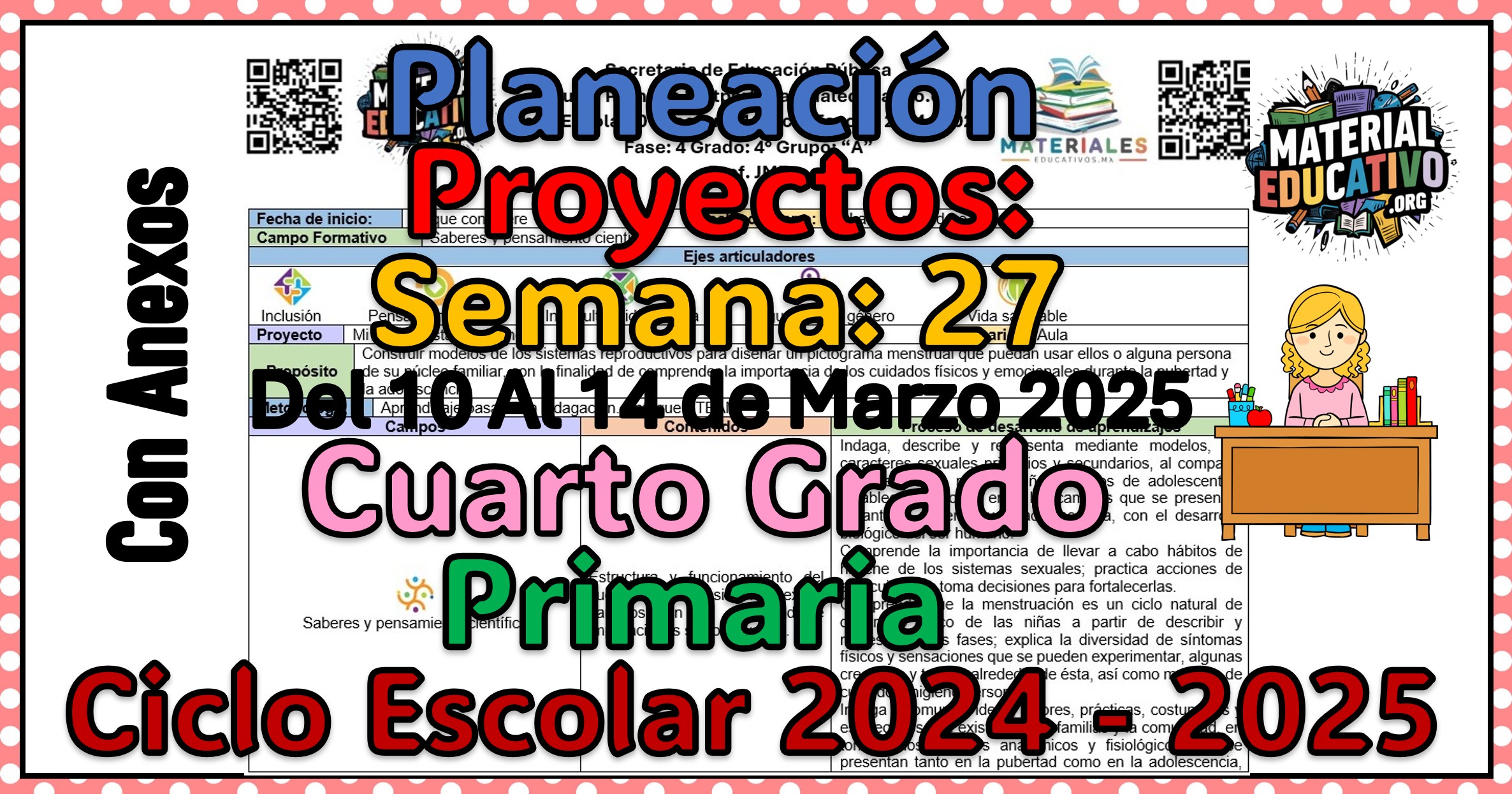 Compañeros maestros y maestras que nos acompañan queremos compartir con todos ustedes la Planeación didáctica por proyectos del cuarto grado de primaria semana 27 del ciclo escolar 2024 – 2025. Del 10 al 14 de marzo de 2025.