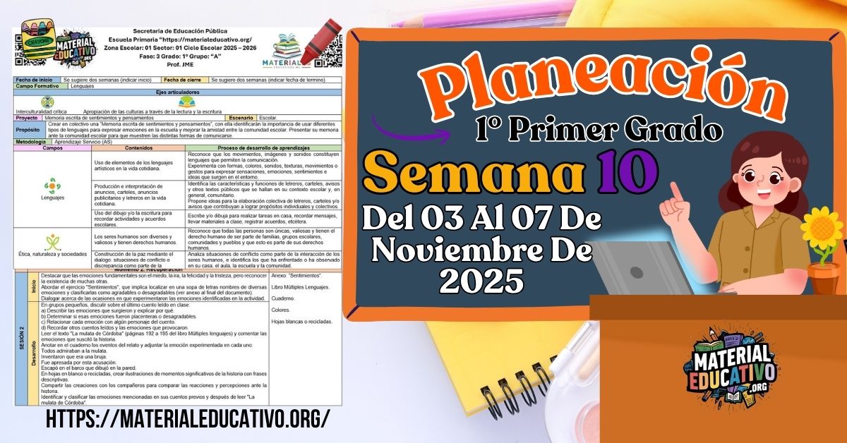 Compañeros y compañeras que nos visitan, con el gusto de saludarlos queremos compartir la Planeación didáctica por proyectos del primer grado de primaria semana 10 del 03 al 07 de noviembre del ciclo escolar 2025 – 2026.