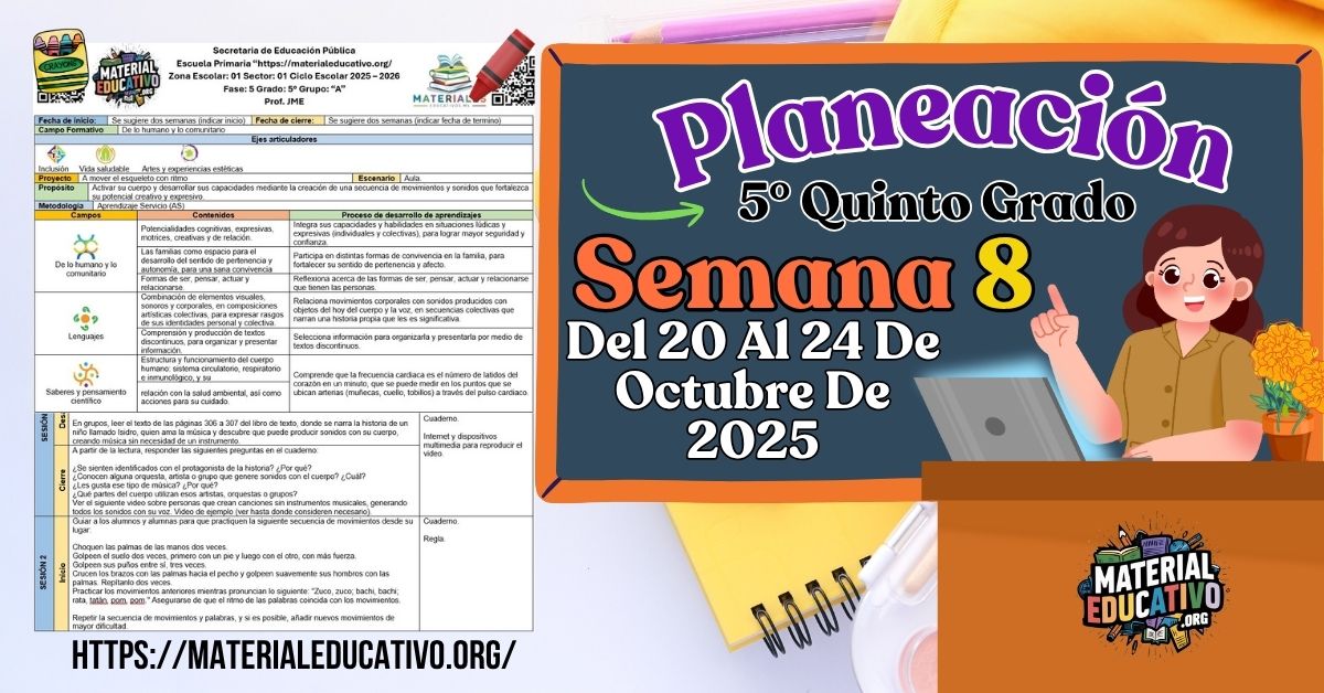 Compañeros y compañeras que nos visitan, con el gusto de saludarlos queremos compartir la Planeación didáctica por proyectos del quinto grado de primaria semana 8 del 20 al 24 de octubre ciclo escolar 2025 – 2026.
