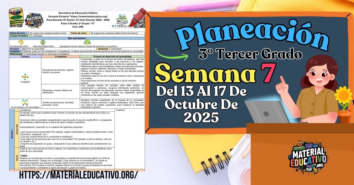 Compañeros y compañeras que nos visitan, con el gusto de saludarlos queremos compartir la Planeación didáctica por proyectos del tercer grado de primaria semana 7 del 13 al 17 de octubre ciclo escolar 2025 – 2026.
