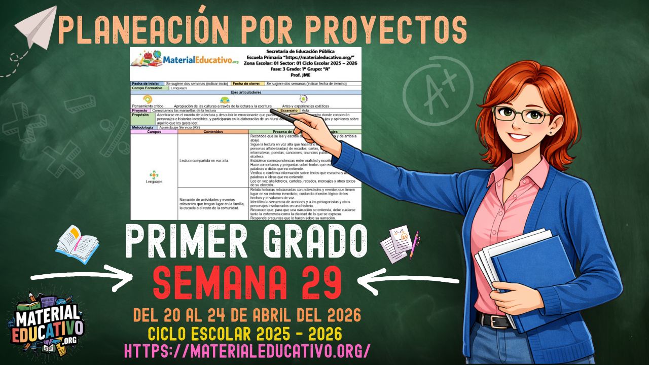 La Planeación por proyectos para el primer grado de primaria, correspondiente a la semana 29 del ciclo escolar 2025 – 2026, es un recurso didáctico diseñado bajo el enfoque del Plan de Estudios 2022 de la Nueva Escuela Mexicana (NEM), centrado en el aprendizaje significativo, la inclusión y el desarrollo integral de las niñas y los niños.