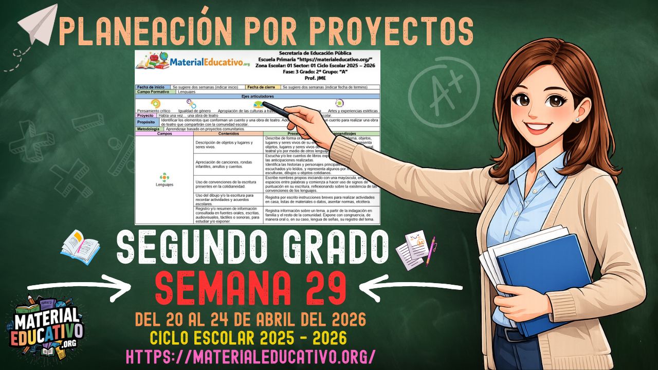 La Planeación por proyectos para el segundo grado de primaria, correspondiente a la semana 29 del ciclo escolar 2025 – 2026, es un recurso didáctico diseñado bajo el enfoque del Plan de Estudios 2022 de la Nueva Escuela Mexicana (NEM), centrado en el aprendizaje significativo, la inclusión y el desarrollo integral de las niñas y los niños.