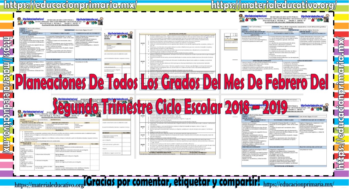 Compañeros y amigos docentes que nos visitan, continuamos actualizando las planeaciones en este momento les queremos compartir las planeaciones de todos los grados del mes de febrero del segundo trimestre ciclo escolar 2018 – 2019, pueden utilizar esta planeación para realizar su planeación o pueden utilizar realizando las adecuaciones necesarias para su grupo, claro de acuerdo a las necesidades y características de sus alumnos, pueden añadir actividades para mejorar las planeaciones, también recuerden que en https://materialeducativo.org/ pueden encontrar una gran variedad de materiales para enriquecer su práctica educativa, les pedimos que nos ayuden recomendando a sus compañeros y amigos docentes nuestra página, recuerden compartir y etiquetar a sus compañeros y amigos docentes en nuestras publicaciones, muchas gracias y excelente día.