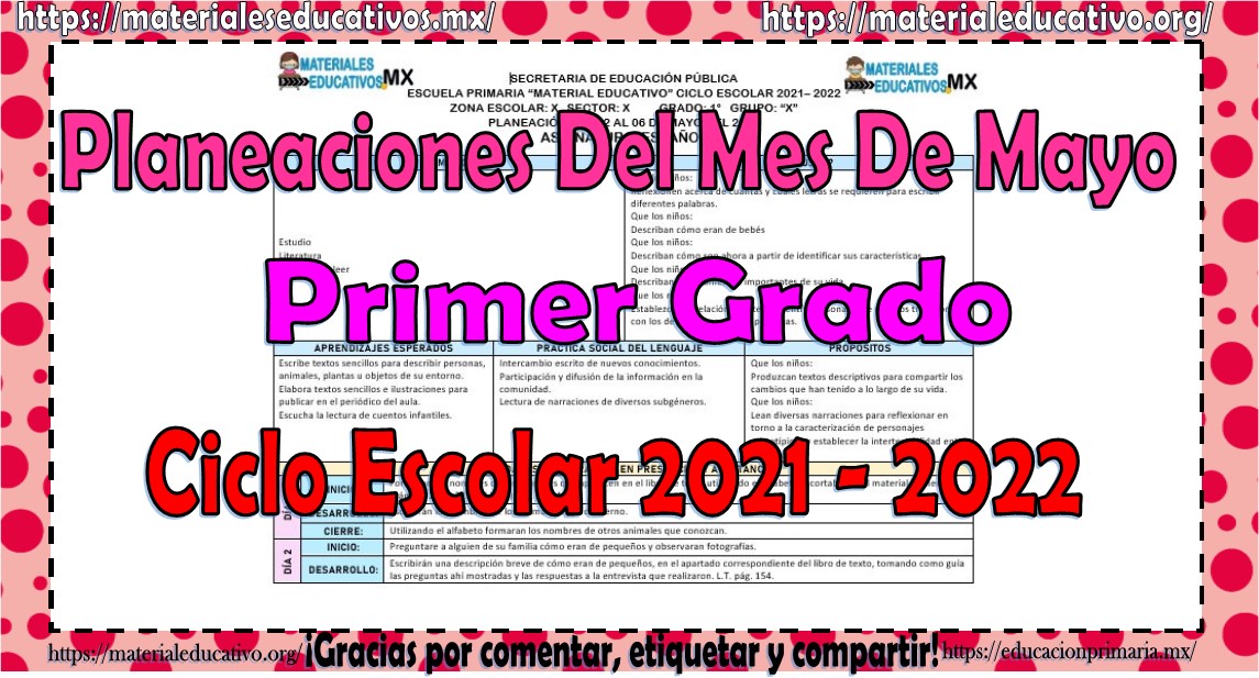Amigas y amigos docentes queremos compartir con todos ustedes las planeaciones del primer grado de primaria del mes de mayo del ciclo escolar 2021 – 2022, con las que podemos trabajar y adaptar de acuerdo a las necesidades y características de nuestros alumnos durante dicho mes y ciclo escolar, estamos seguros que les será de gran utilidad para su labor educativa, queremos agradecer al autor de este material y nuestro agradecimiento por enviárnosla, muchas gracias por su apoyo y recuerden compartir nuestras publicaciones en sus redes sociales y recuerden etiquetar a sus compañeros y amigos docentes en nuestras publicaciones.