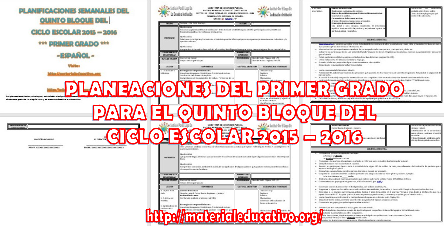 Compañeros maestros estamos dentro de la recta final del ciclo escolar para ello les compartimos las planeaciones del primer grado para el quinto bloque del ciclo escolar 2015 – 2016, es importante abordar el último bloque y bimestre de manera correcta con estas planeaciones que debemos abordar y adecuar a las necesidades de nuestros alumnos, agradecemos a los autores de este material, muchas gracias por compartir los enlaces en sus redes sociales y con sus compañeros de escuela y maestros conocidos que les puedan ser de utilidad en su labor docente.