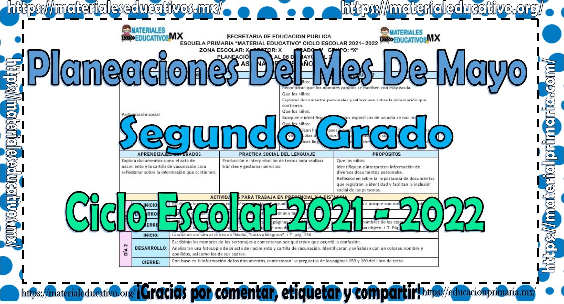 Amigas y amigos docentes queremos compartir con todos ustedes las planeaciones del segundo grado de primaria del mes de mayo del ciclo escolar 2021 – 2022, con las que podemos trabajar y adaptar de acuerdo a las necesidades y características de nuestros alumnos durante dicho mes y ciclo escolar, estamos seguros que les será de gran utilidad para su labor educativa, queremos agradecer al autor de este material y nuestro agradecimiento por enviárnosla, muchas gracias por su apoyo y recuerden compartir nuestras publicaciones en sus redes sociales y recuerden etiquetar a sus compañeros y amigos docentes en nuestras publicaciones.