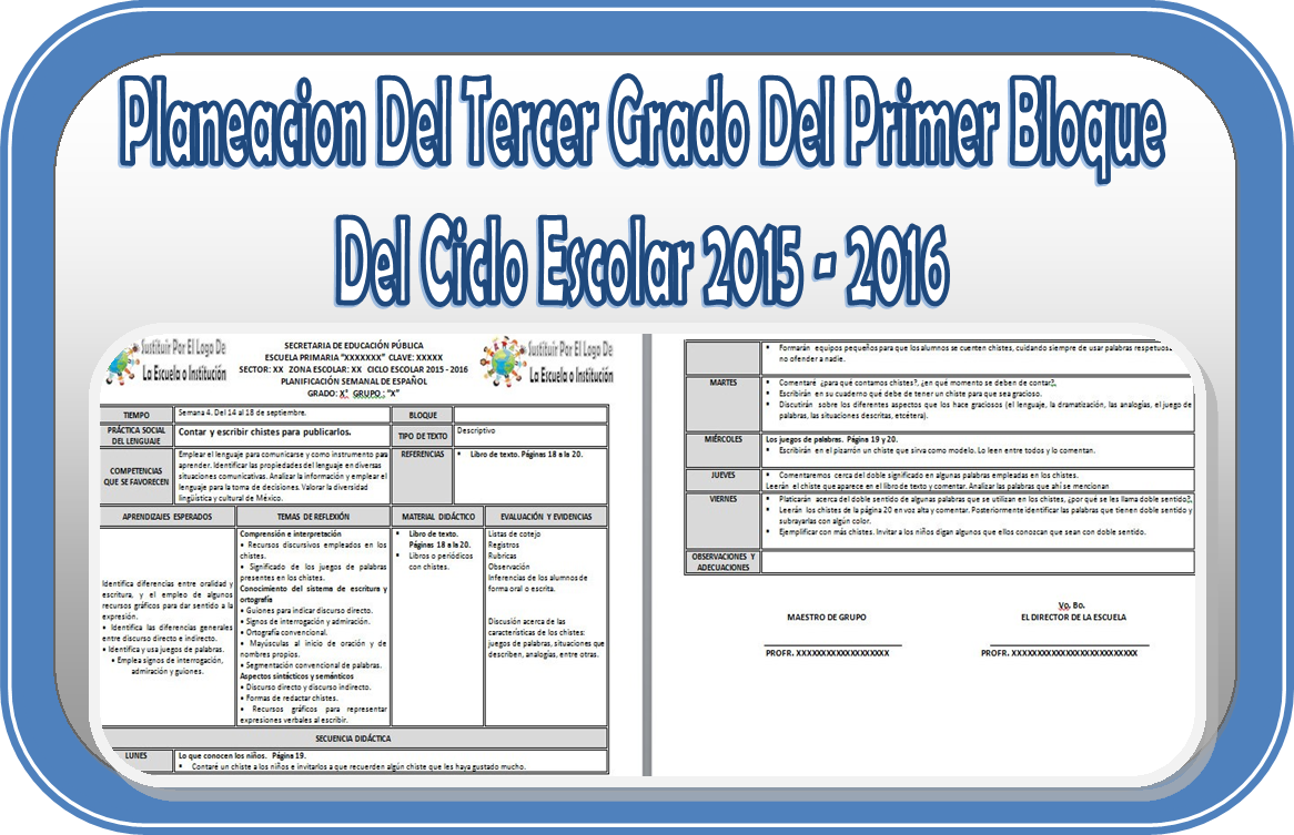 Compartimos las Planeación del tercer grado del primer bloque del ciclo escolar 2015 – 2016, estas planeaciones nos las enviaron para compartirlas con todos ustedes compañeros y amigos docentes, agradecemos a los autores de este material, esperamos que les sea de gran utilidad en su labor docente, esperamos puedan compartir los enlaces en sus redes sociales, muchas gracias por su apoyo compañeros y amigos docentes.