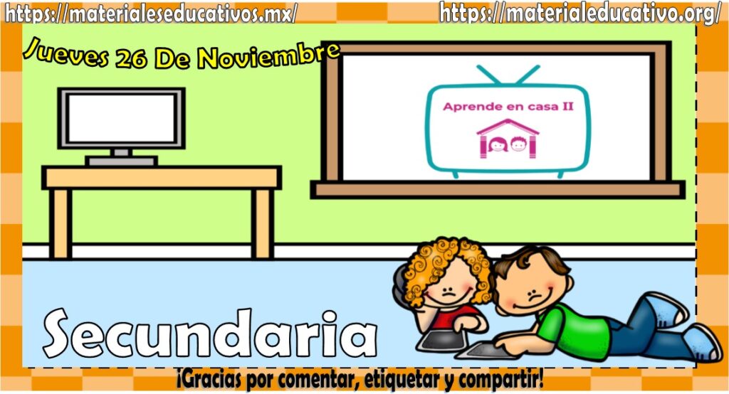 Amigos, compañeros docentes, padres de familia y alumnos que nos visitan, como ya es costumbre nosotros les proporcionaremos las clases contempladas para observarse en la TV del programa aprende en casa II. En esta oportunidad les queremos proporcionar las preguntas y videos de aprender en casa II mis clases de secundaria del jueves 26 de noviembre del 2020 del presente ciclo escolar 2020 – 2021, en sí son las preguntas y videos, estaremos seguros que con este material podrá facilitar la realización de las actividades planteadas por parte del programa. Muchas gracias por visitarnos y recuerden que aquí podrán encontrar las preguntas, videos y todas las clases del programa de aprende en casa 2. Recuerden compartir nuestros enlaces en sus redes sociales y etiquetar a sus compañeros y amigos docentes en nuestras publicaciones.