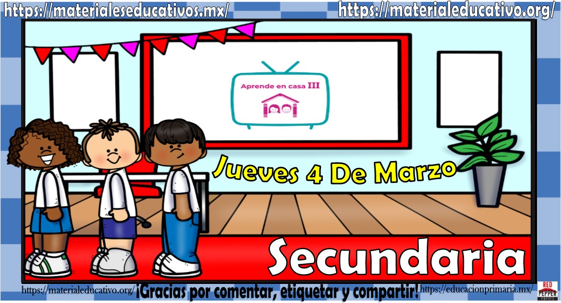 Amigos, compañeros docentes, padres de familia y alumnos que nos visitan, como ya es costumbre nosotros les proporcionaremos las clases contempladas para observarse en la TV del programa aprende en casa III. En esta oportunidad les queremos proporcionar las preguntas y videos de aprender en casa III mis clases de secundaria del jueves 4 de marzo del 2021 del presente ciclo escolar 2020 – 2021, en sí son las preguntas y videos, estaremos seguros que con este material podrá facilitar la realización de las actividades planteadas por parte del programa. Muchas gracias por visitarnos y recuerden que aquí podrán encontrar las preguntas, videos y todas las clases del programa de aprende en casa 2. Recuerden compartir nuestros enlaces en sus redes sociales y etiquetar a sus compañeros y amigos docentes en nuestras publicaciones.