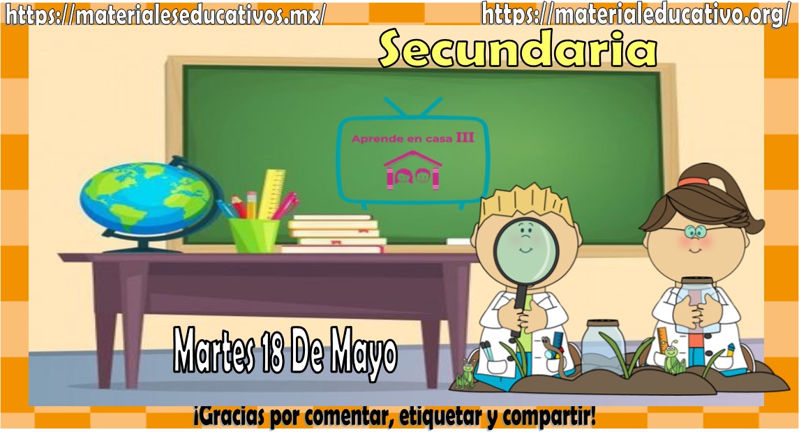 Amigos, compañeros docentes, padres de familia y alumnos que nos visitan, como ya es costumbre nosotros les proporcionaremos las clases contempladas para observarse en la TV del programa aprende en casa III. En esta oportunidad les queremos proporcionar las preguntas y videos de aprender en casa III mis clases de secundaria del martes 18 de mayo del 2021 del presente ciclo escolar 2020 – 2021, en sí son las preguntas y videos, estaremos seguros que con este material podrá facilitar la realización de las actividades planteadas por parte del programa. Muchas gracias por visitarnos y recuerden que aquí podrán encontrar las preguntas, videos y todas las clases del programa de aprende en casa 2. Recuerden compartir nuestros enlaces en sus redes sociales y etiquetar a sus compañeros y amigos docentes en nuestras publicaciones.