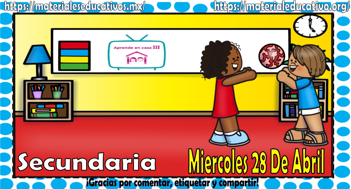 Amigos, compañeros docentes, padres de familia y alumnos que nos visitan, como ya es costumbre nosotros les proporcionaremos las clases contempladas para observarse en la TV del programa aprende en casa III. En esta oportunidad les queremos proporcionar las preguntas y videos de aprender en casa III mis clases de secundaria del miércoles 28 de abril del 2021 del presente ciclo escolar 2020 – 2021, en sí son las preguntas y videos, estaremos seguros que con este material podrá facilitar la realización de las actividades planteadas por parte del programa. Muchas gracias por visitarnos y recuerden que aquí podrán encontrar las preguntas, videos y todas las clases del programa de aprende en casa 2. Recuerden compartir nuestros enlaces en sus redes sociales y etiquetar a sus compañeros y amigos docentes en nuestras publicaciones.